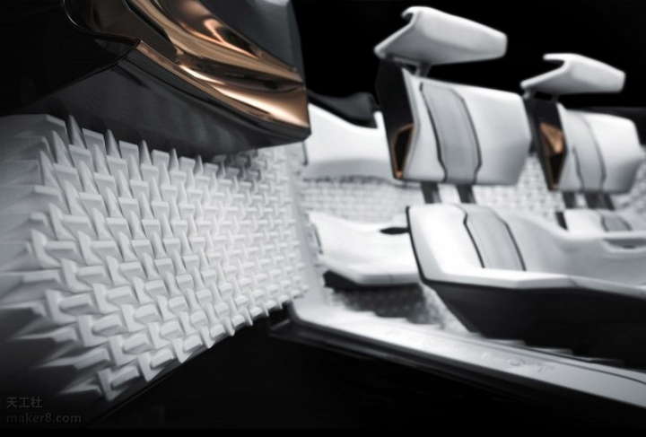 标致Fractal整个内饰面积超过15平方米汽车,开发团队在设计过程中使用的算法来正确配置各种材料,以确保声学效果。而3D打印让团队能够打造出它们所需要的高度复杂的零件和曲面。