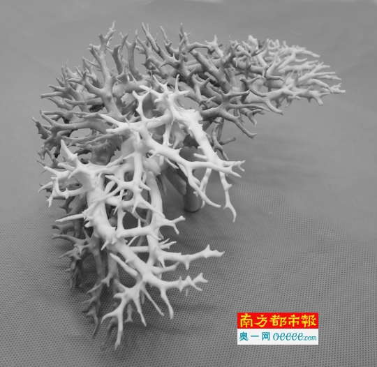 同一天,在离南方医科大学10多公里外的珠江医院内,今年4月中刚完成肝癌切除手术的吴先生正在复查。之前肝癌合并复杂肝硬化的他原本要被切掉60%以上的肝脏,严重影响生命安全,但一方面有南方医科大学临床解剖学研究所所长徐传达教授设计的微创外科入路的理论支撑,另一方面黄文华教授用3D打印机打印出一个病变肝脏,肝静脉、动脉、门静脉纤毫毕现,供外科专家提前实操、反复论证,最后吴先生只切除了42.8%的肝脏。