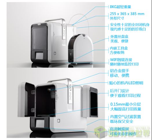 除了以上几个突出功能外,在外观上我们也可以非常清楚地看到UP mini 2的外观非常时尚,内置工具箱和WIFI连接功能,让消费者能够把它当成一件家用电器,而不是冷冰冰的打印机,我们真心希望消费者能够看见之后喜欢它,使用之后爱上它!