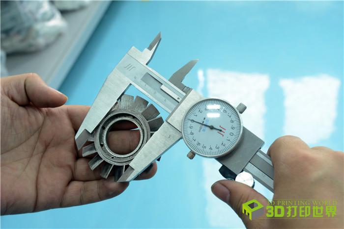 打磨完毕后,刘希用专业量具游标卡尺测量叶轮样件的外径、内径、长度、宽度、厚度、深度和孔距等,让样件严格达到客户要求的标准。测量单位精确到“丝”。如同一个铁面无私的卫兵,游标卡尺上的指针只认检测数据,如果加工精度达不到标准,绝不会让部件进入下一道工序。