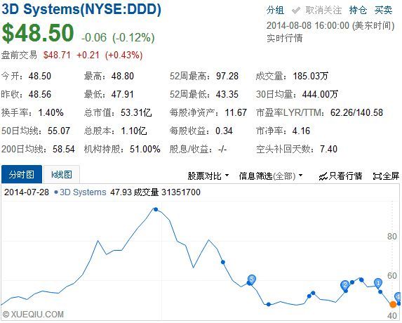 自2014年以来3D Systems股价下跌超过40% 图源:xueqiu.com
