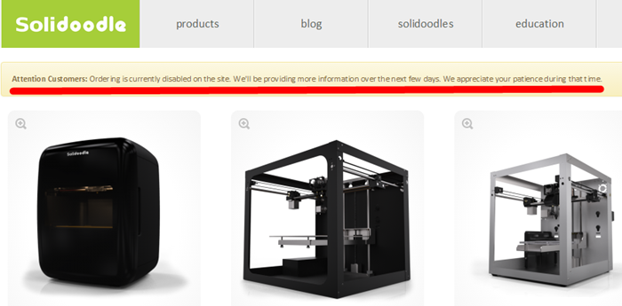 从2011年就已经成立,甚至曾经是桌面3D打印机市场上领先的厂商之一,Solidoodle公司如今似乎陷入了某种危机之中。2016年3月7日,这家总部位于布鲁克林的公司官网顶部出现了一条不同寻常的消息,其内容如下:“客户们请注意:本网站的订购功能现已禁用。在接下来的几天里,我们将会提供更多的信息,感谢您在这段时间里的耐心。(Attention Customers: Ordering is currently disabled on the site. We’ll be providing more information over the next few days. We appreciate your patience during that time)”