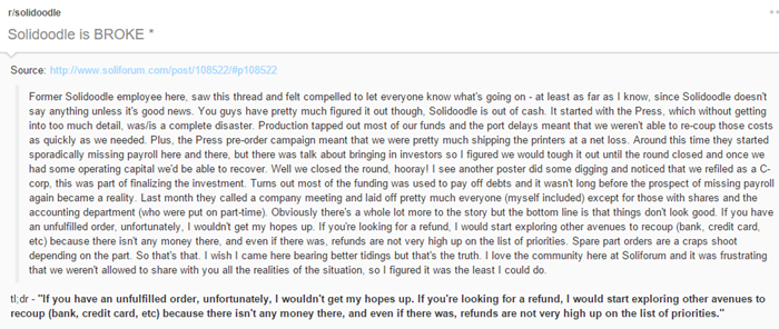在热门论坛Reddit上,2015年10月份的时候曾经有一名自称为Solidoodle前员工的网友发帖爆出了Solidoodle公司的种种乱象,称当时Solidoodle公司的现金就已经消耗殆尽,雪上加霜的是,其Press 3D打印机的预购活动属于亏本销售。这名网友称,该公司的大部分资金都已经用来偿还债务,并进行了大量的裁员等。