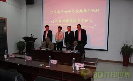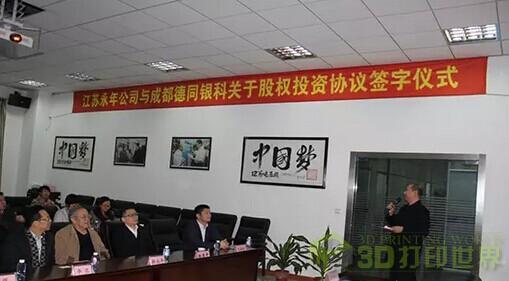 2015年11月18日,江苏永年(3D打印)与德同资本(成都银科)关于股权投资协议在昆山高新区机器人产业园成功签约。这标志着江苏永年经过2年多的科技孵化和成果转化与国内知名的金融资本完美结合,在新的起点上加快推进金属3D打印技术产业化的步伐。