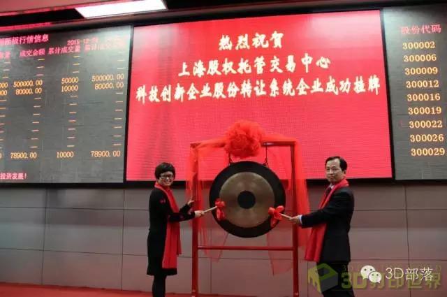 2015年12月28日,业界期盼已久的科技创新板(简称“科创板”)在上海股权托管交易中心(简称“上股交”)正式开盘,并举行了隆重的开盘仪式,上海市市长杨雄、副市长屠光绍等领导出席了开盘仪式。据了解,国内3D打印行业的领军企业三的部落(上海)科技股份有限公司作为上股交E板挂牌的优秀高科技企业成功转板,成为首批科创板挂牌的20多家企业之一,股份简称:三的部落,股份代码:300022。