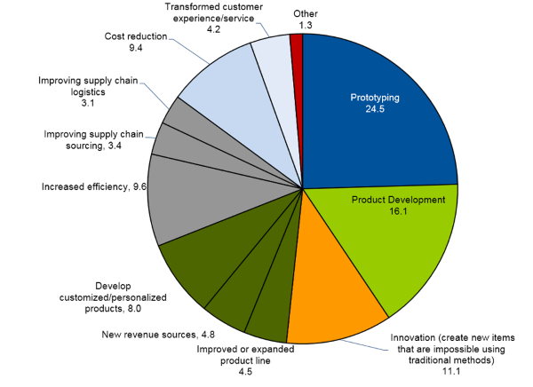 调查结果还显示,虽然原型设计、产品的创新和开发是3D打印技术的主要应用领域,但该技术也被广泛用于制造方面的应用(见下图)。