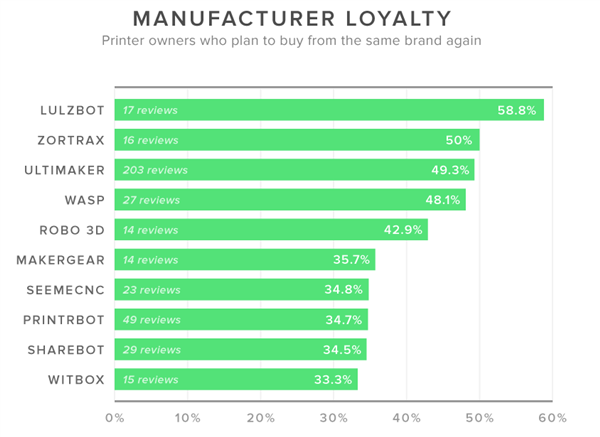 “Lulzbot拥有最忠实的用户,其58.8%的用户会下次继续购买Lulzbot的产品。”报告说。“Zortrax以50%的保留率据第二为。而Ultimaker则以49.3%的比率获得了第三名。”