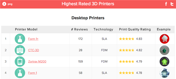 Form1+尽管以一票之差无缘“人们最想要的3D打印机”称号,但是人家的实力在那摆着,所以在“评分最高的3D打印机”排行榜上,它获得了无可争议的第一名。值得注意的是我国3D打印机厂商珠海西通电子的产品CTC-3D紧随其后,获得了第二名。