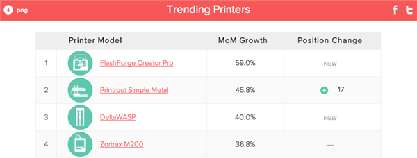 当然,由于多家初创的3D打印机生产商的兴起,3D Hubs的平台上出现了很多新的3D打印机品牌,尽管其品牌影响力尚不能与MakerBot、Ultimaker或Formlabs这些知名厂家相比,但其在3D Hubs平台上注册的数量增长相当快,这其中增长最快的当数来自我国闪铸科技的Creator Pro,其注册的机器数量比上月猛增了59%,其次是Printrbot Simple的45.8%,意大利的DeltaWASP以40%的增长率排在第三位。(天工社注:所谓3D打印机注册数量是指如果您有一台3D打印机而且愿意在3D Hubs的平台上为别人提供有偿的3D打印服务,就需要将您的3D打印机信息在该平台上注册。)