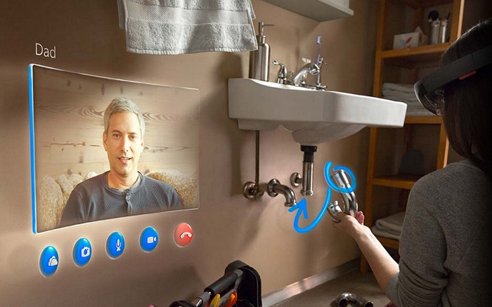 不过这不妨碍他体验到一些关键的操作细节:比如只需移动头部就能移动游标,透过手势来进行选择。Rosoff 一共体验四个应用程序。在一个展示中,他透过HoloLens 中的Skype App 和水电工 Lloyd 沟通,在他的帮助下安装电灯开关。Lloyd 出现在一个虚拟的小视窗中,Lloyd 的Surface 荧幕与Rosoff 视野同步,他还在可以Rosoff 眼前“画画”。比如他画了一个图指导Rosoff 如何一边握住开关一边接入电线。如果Rosoff 想要更清晰的视野,就可以把扩增实境的小视窗“钉住”,这样就可以专注于真实的现场。
