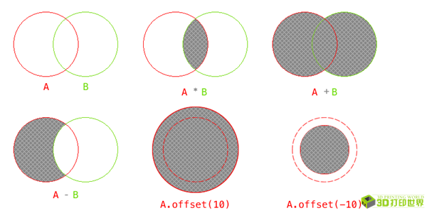 这里我先简单介绍一下CuraEngine所用到的几种2D图形的运算,都是由ClipperLib实现的:交、并、减、偏移。它们与集合操作类似,先看图: