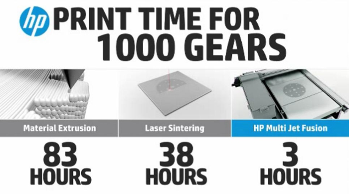 如上面所述,惠普的这款3D打印机的打印速度将超过当下最快的增材制造设备的10倍。为了更加形象和易于理解,惠普提供了一组统计数据。以批量生产1000个齿轮为例,使用高品质的激光烧结设备,这些齿轮至少需要38小时才能制造出来。而使用他们的新多喷头熔融技术,只需3个小时即可完成。